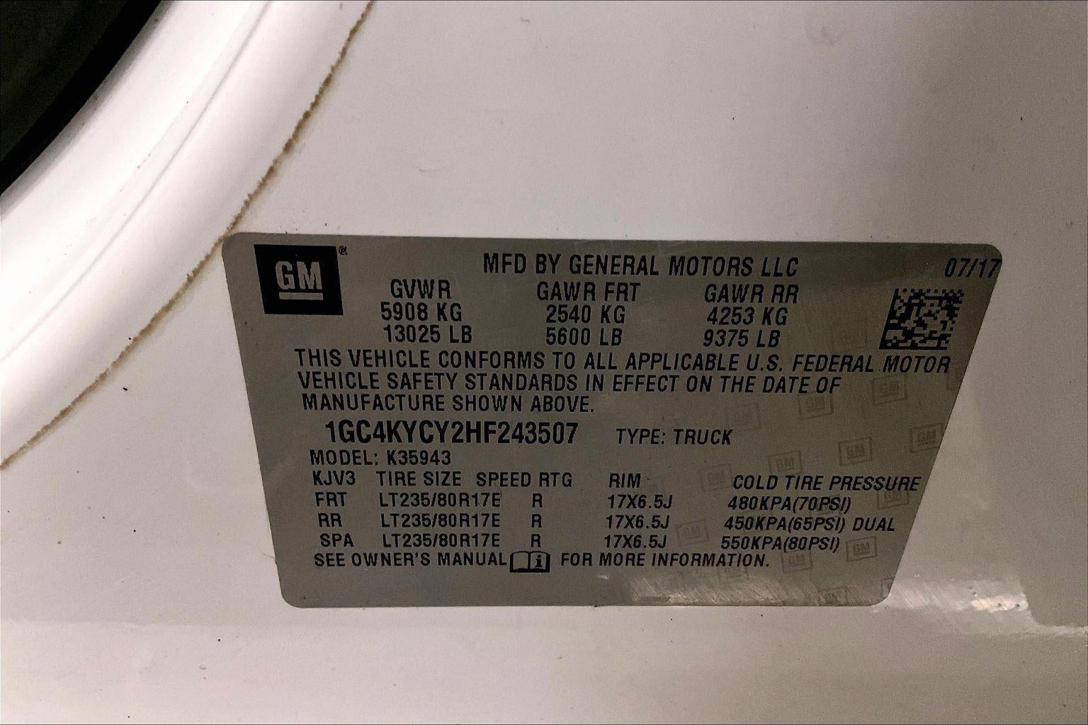 GVWR, 13,025 LBS. (5908 KG) WITH DUAL REAR WHEELS, PICKUP BOX, SUSPENSION PACKAGE, STANDARD, EMISSIONS, CONNECTICUT, DELAWARE, MAINE, MARYLAND, MASSACHUSETTS, NEW JERSEY, NEW YORK, OREGON, PENNSYLVANIA, RHODE ISLAND, VERMONT AND WASHINGTON STATE REQUIREMENTS, ENGINE, DURAMAX 6.6L TURBO DIESEL V8, B20-DIESEL COMPATIBLE, TRANSMISSION, ALLISON 1000 6-SPEED AUTOMATIC, ELECTRONICALLY CONTROLLED, REAR AXLE, 3.73 RATIO, WHEELS, 17"" (43.2 CM) PAINTED STEEL, TIRES, LT235/80R17E ALL-SEASON HIGHWAY, TIRE, SPARE LT235/80R17E HIGHWAY, PAINT, SOLID, SUMMIT WHITE, SEATS, FRONT 40/20/40 SPLIT-BENCH, 3-PASSENGER, DRIVER AND FRONT PASSENGER RECLINE, DARK ASH WITH JET BLACK INTERIOR ACCENTS, CLOTH SEAT TRIM, AUDIO SYSTEM, CHEVROLET MYLINK RADIO WITH 7"" DIAGONAL COLOR TOUCH-SCREEN, AM/FM STEREO, WT CONVENIENCE PACKAGE, ENGINE BLOCK HEATER, ALTERNATORS, DUAL, 150 AMPS AND 220 AMPS EACH, GOOSENECK / 5TH WHEEL PREP PACKAGE -- HITCH PLATFORM TO ACCEPT GOOSENECK OR FIFTH WHEEL HITCH., TRAILER BRAKE CONTROLLER, INTEGRATED, BRAKES, 4-WHEEL ANTILOCK, 4-WHEEL DISC WITH DUAL REAR WHEELS, EXHAUST BRAKE, WHEEL, 17"" X 6.5"" (43.2 CM X 16.5 CM) FULL-SIZE, STEEL SPARE., WHEEL TRIM, PAINTED TRIM SKINS AND PAINTED CENTER CAPS, LAMPS, SMOKED AMBER ROOF MARKER, LED LIGHTING, CARGO BOX, MIRRORS, OUTSIDE HEATED POWER-ADJUSTABLE VERTICAL TRAILERING, UPPER GLASS, MANUAL-FOLDING AND EXTENDING, BLACK;, GLASS, DEEP-TINTED, LICENSE PLATE KIT, FRONT, REMOTE LOCKING TAILGATE, BED LINER, SPRAY-ON, ONSTAR WITH 4G LTE AND BUILT-IN WI-FI HOTSPOT CONNECTS TO THE INTERNET AT 4G LTE SPEEDS;, REMOTE KEYLESS ENTRY, POWER OUTLET, 110-VOLT AC, MIRROR, INSIDE REARVIEW AUTO-DIMMING, ONSTAR GUIDANCE PLAN, REAR VISION CAMERA